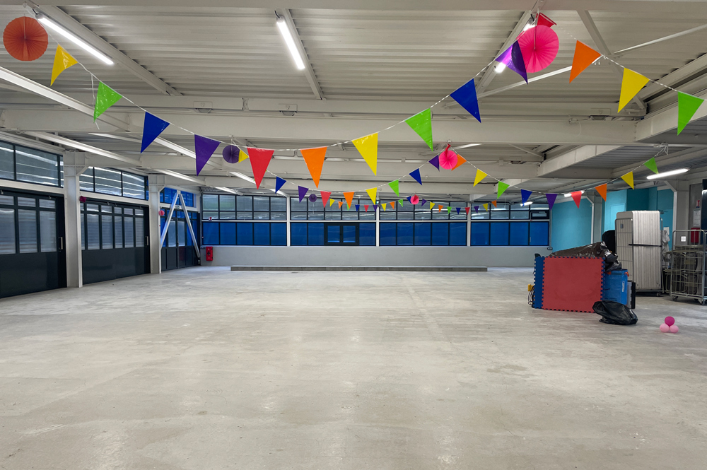 Cette ancienne piscine municipale, a été transformée depuis le printemps 2024 en une halle de 500 m² avec un jardin à l’arrière.