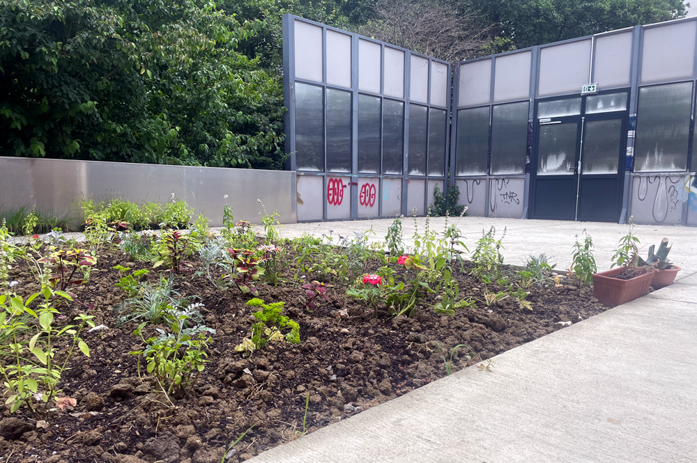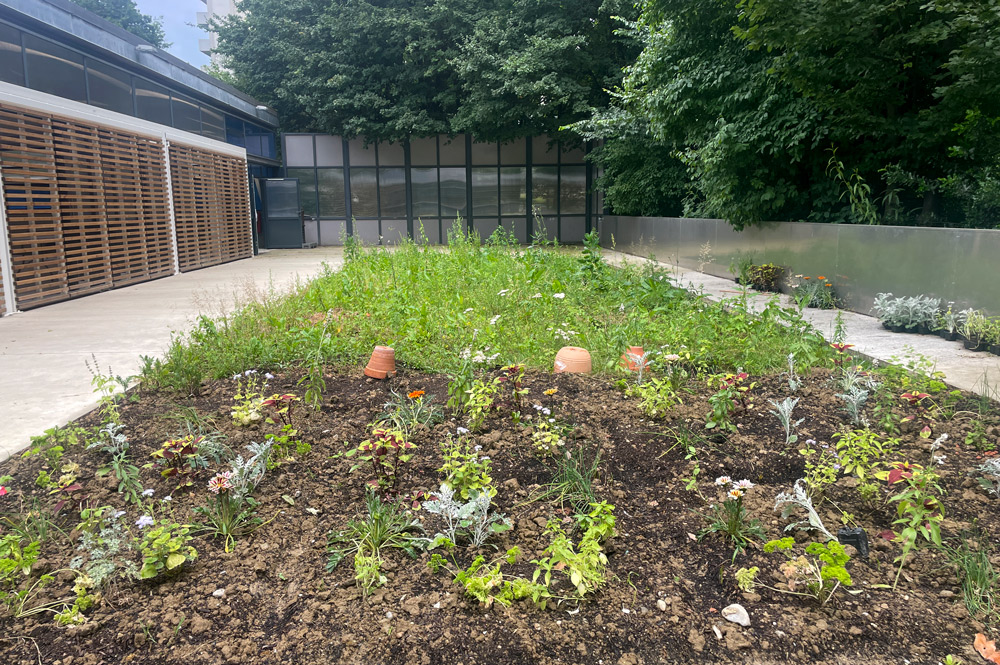 Dans le programme de rénovation de l’ancienne piscine, l’ancien solarium a été « décroûté » sur une surface de 100 m² et creusé à 50 cm environ de profondeur, pour créer l’emplacement d’un jardin. Le choix de le consacrer à la culture de plantes aromatiques est pensé dès le début de l’association, en synergie avec l’animation d’une tisanerie. La production alimente un stock de plantes séchées et conservées. Jardin et tisanerie sont les deux volets d’une activité de fond de la Halle des Iris, à partir de laquelle se déclinent d’autres propositions relatives à la connaissance (balades botaniques, art de la tisane, culture, multiplication et transformation des aromatiques…), au bien-être et le bien vivre par le rapport à la nature dans le cadre de l’alimentation, du rapport social et de la qualité du cadre de vie.