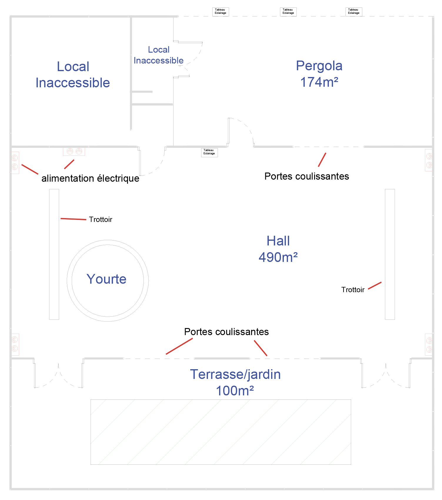 - Un hall central de 490 m², architecture fonctionnelle, dalle de ciment, larges ouvertures possibles. (En ce moment, une yourte légère auto-portante de 6m de diamètre a été posée).